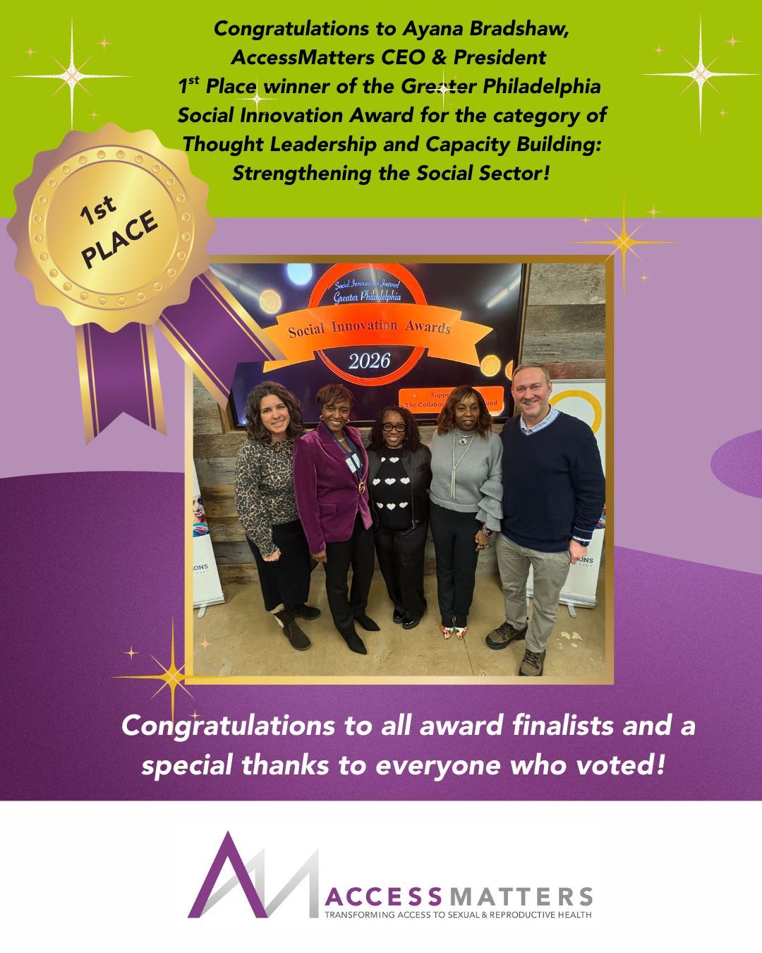 | | AccessMatters’ President and CEO Ayana Bradshaw Wins Greater Philadelphia Social Innovation Award AccessMatters’ President and CEO Ayana Bradshaw won first place in the 2026 Greater Philadelphia Social Innovation Award for the category “Thought Leadership and Capacity Building”. The award honors leaders and changemakers in the Philadelphia region working to transform the social services sector. Congratulations, Ayana! Thank you to everyone who voted this year. |